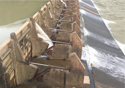 翻板壩阻水,經(jīng)不住洪水的沖擊,易被漂浮物卡塞或上游淤積造成不能自動翻板,容易被洪水沖壞壩體影響防洪安全。洪水過后翻板門再關(guān)上時被異物卡住,造成大量漏水,一旦淤積厚度較大或泥沙板結(jié),閘門就不能正常回門(眾多閘門中只要有一扇),將影響河道正常蓄水。汛期漂浮物(特別是樹枝)經(jīng)常卡住閘門導致起翻或回落困難,威脅到行洪安全。